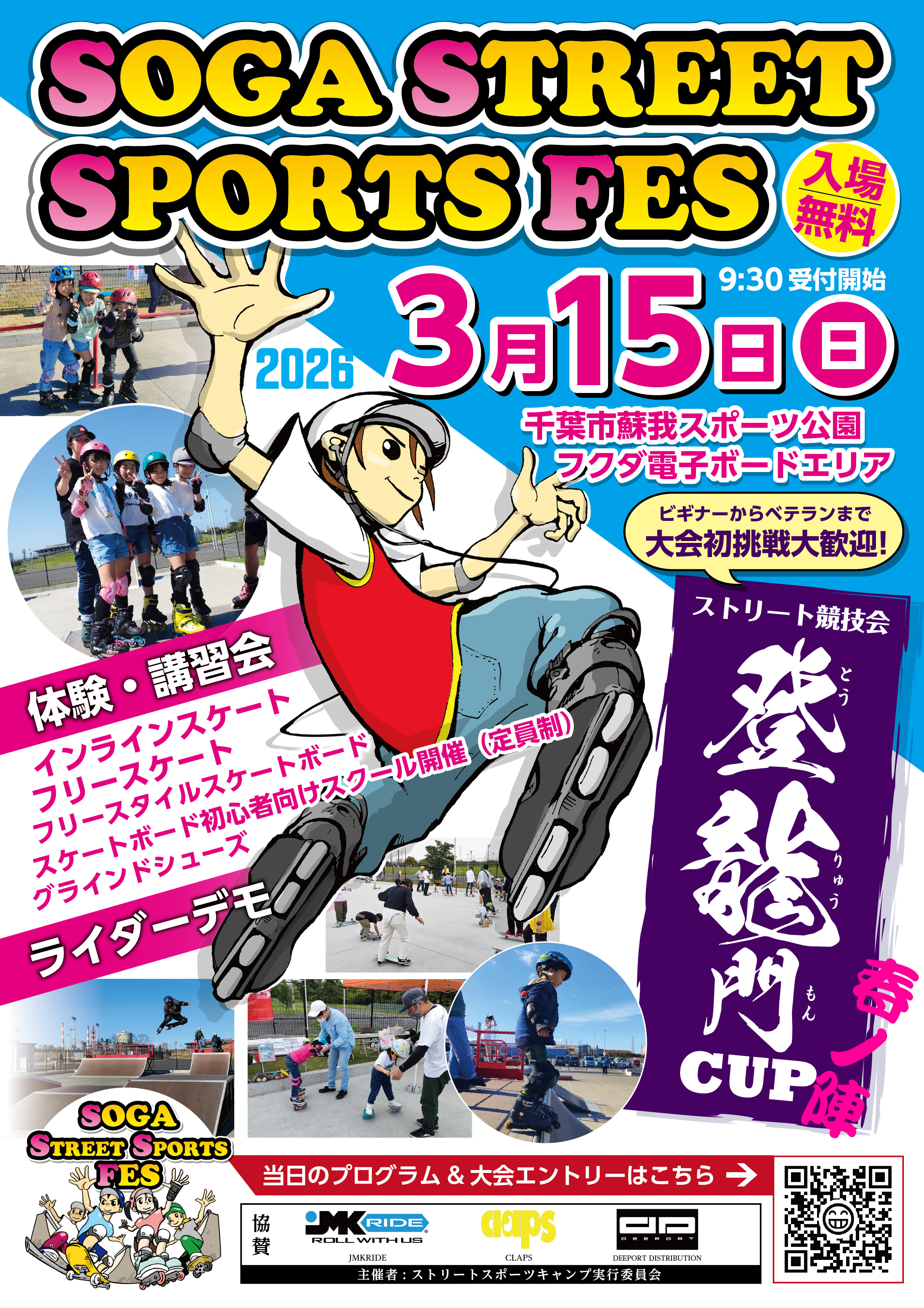 | 蘇我ストリートスポーツフェスは、「ストリートスポーツを、もっと身近に」をコンセプトに、初めての方、ビギナーの方をメインとした交流イベントです。ビギナーが参加できる大会や体験会など、ストリートスポーツを見て体感できるイベントです。それぞれのプログラムを通じて、ストリートスポーツの面白さ、楽しさ、ルールやマナーの認知、そして参加者も運営スタッフも一緒に楽しめるスポーツコミュニティーの広がりを目的としています。 インラインスケート、フリースケート、フリースタイルスケートボード、グラインドシューズの体験会(レンタル有)、競技大会(第二回登竜門カップ)、デモンストレーションを実施します。それぞれストリートスポーツに興味のある方、体験してみたい方、上達したい方など、この機会にストリートスポーツフェスで一緒に一日遊びましょう!! ストリートスポーツが世代を問わず、身近で楽しいスポーツであることを知って、感じて欲しい!そしてこの蘇我のスケートパークにもまた遊びに来てくださいね(^^)/ |